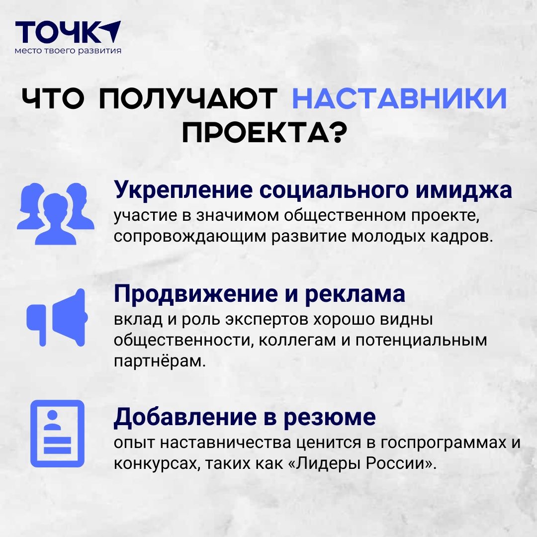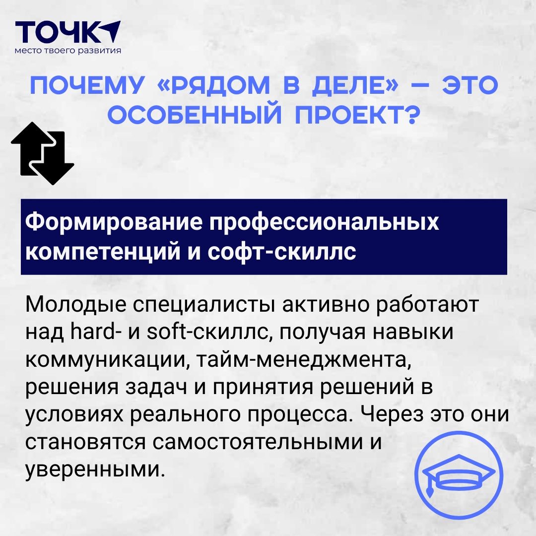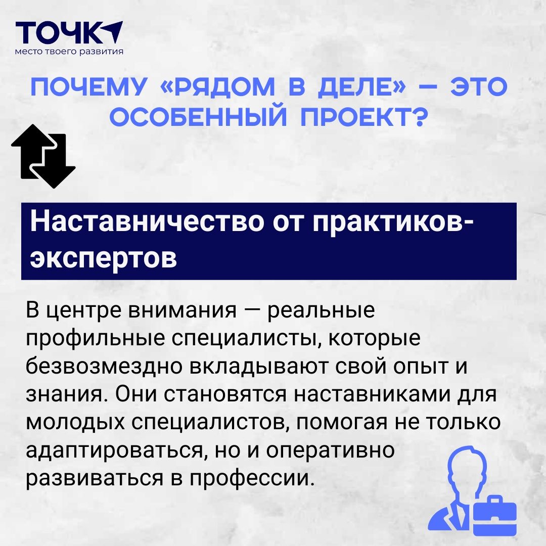 • Наставничество от практиков. В центре внимания - реальные профильные специалисты, которые безвозмездно вкладывают свой опыт и знания. Они становятся наставниками для молодых специалистов, помогая не только адаптироваться, но и оперативно развиваться в профессии.