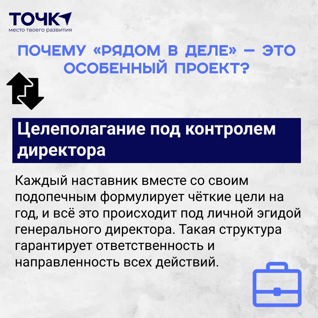 • Целеполагание под контролем директора. Каждый наставник вместе со своим подопечным формулирует чёткие цели на год, и всё это происходит под личной эгидой генерального директора. Такая структура гарантирует ответственность и направленность всех действий.