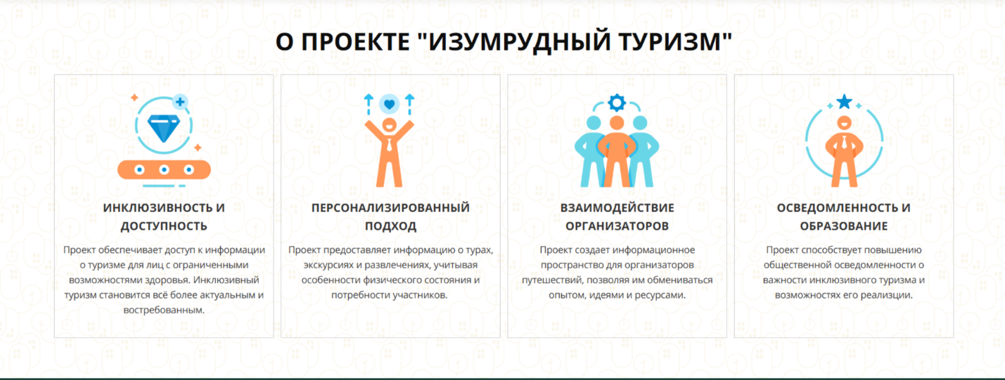 Ресурс собирает информацию о туристических продуктах и созданной доступной инфраструктуры для людей с особыми потребностями, включая лиц с инвалидностью, родителей с детскими колясками и пожилых граждан вместе с их родственниками.